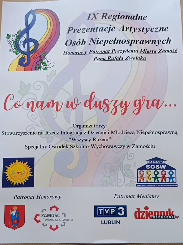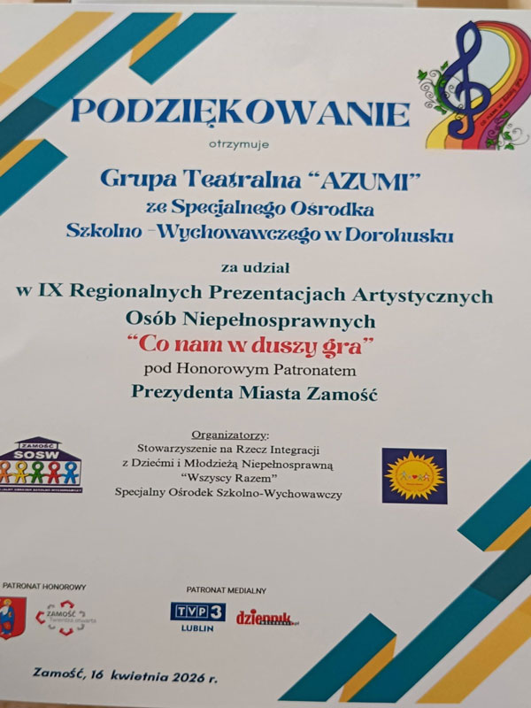 W dniu 16 kwietnia 2026 r. gościliśmy na IX Regionalnych Prezentacjach Artystycznych Osób Niepełnosprawnych w Zamościu, gdzie zadebiutowała na scenie grupa najmłodsza. Cieszymy się z sukcesu i pięknego występu.